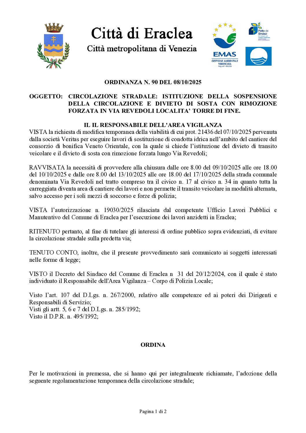 Si informa che, con ordinanza n. 90 dell'08/10/2025, è stata sospesa la circolazione ed istituito il divieto di sosta nel tratto di via Revedoli compreso tra i civici 17 e 34: